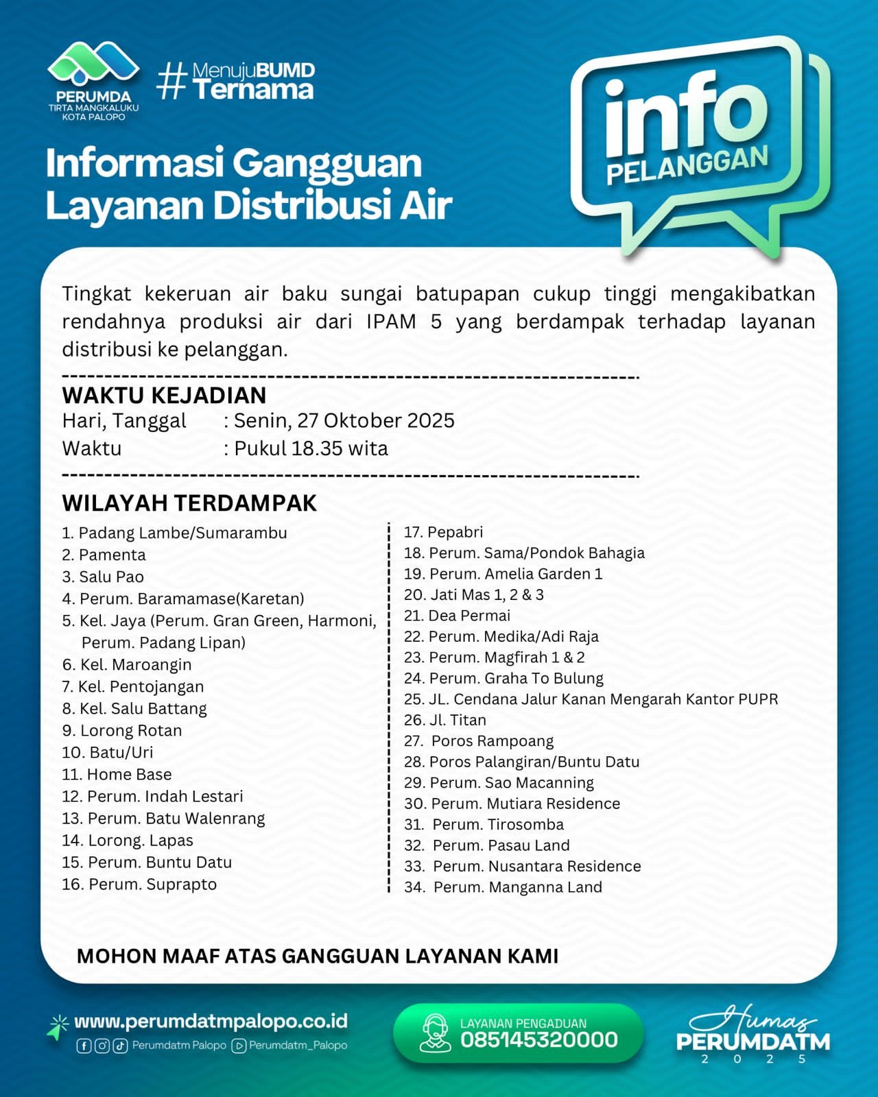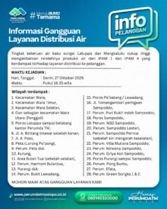 PALOPO,4Menit.Com — Informasi Gangguan Layanan Distribusi Air. Bahwa tingkat kekeruan air baku sungai Latuppa dan Mangkaluku cukup tinggi