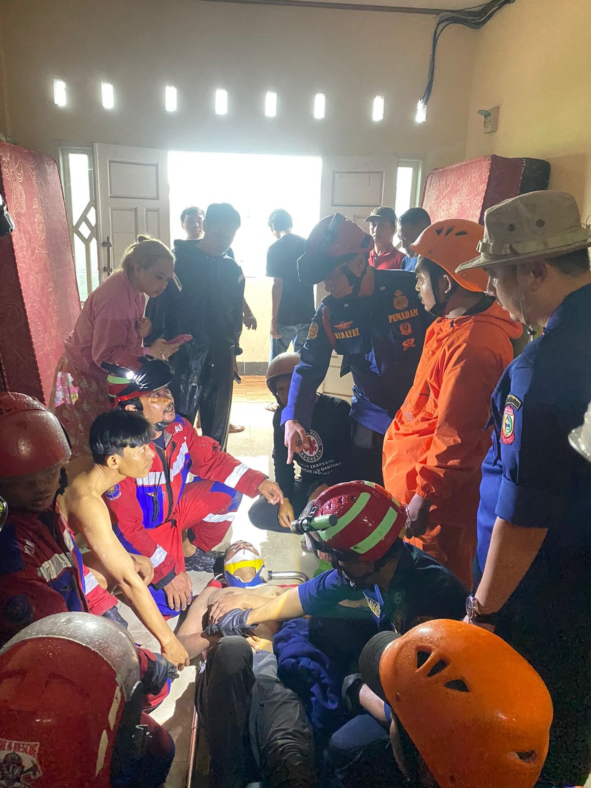 Evakuasi dilakukan dengan sangat hati-hati mengingat kondisi bangunan yang runtuh serta adanya korban perempuan yang sedang hamil tua. Berdasarkan keterangan korban, sang suami berupaya melindungi istrinya dari reruntuhan bangunan.