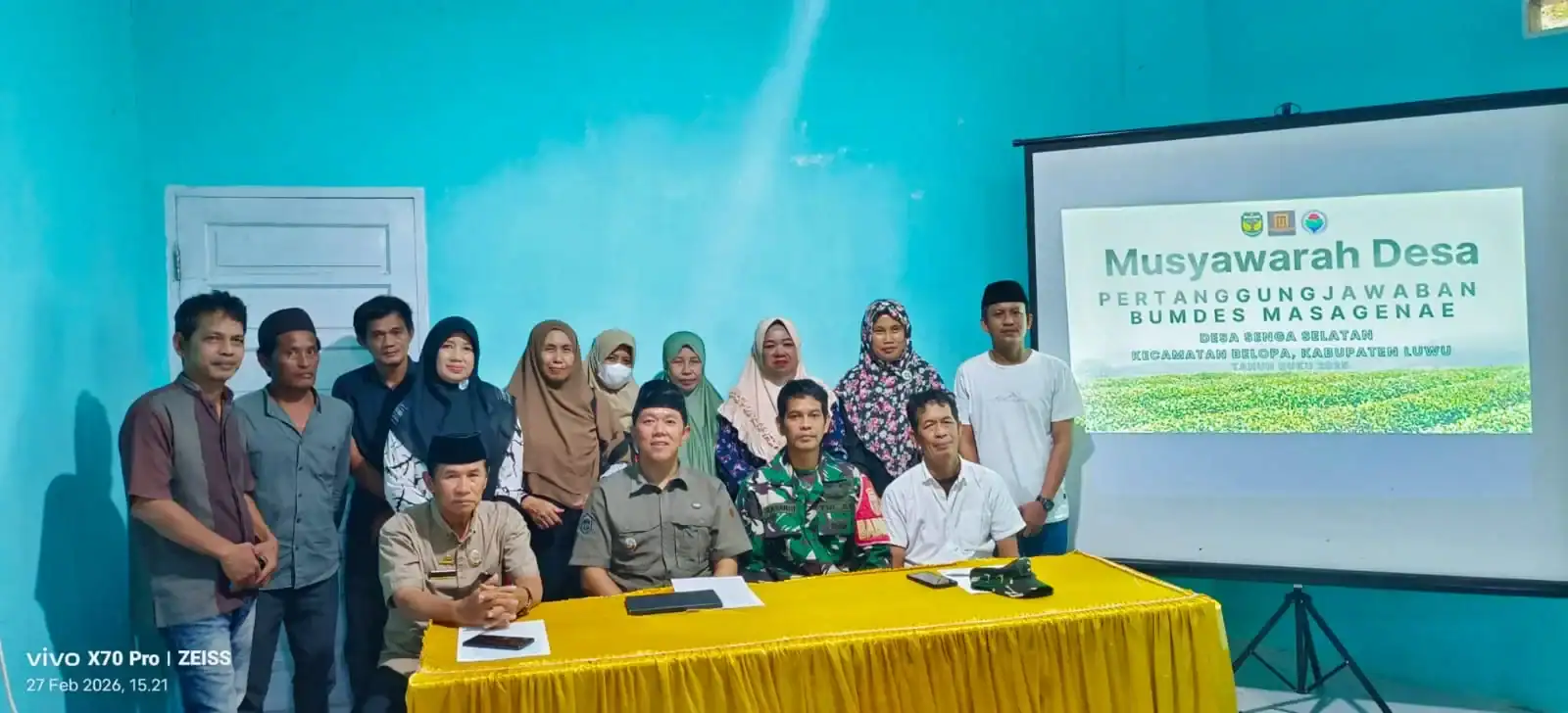 LUWU – Camat Belopa, Latif Muhamad Abduh, menghadiri Musyawarah Desa (Musdes) Pertanggungjawaban atau Tutup Buku Badan Usaha Milik Desa (BUMDes) Masagenae Tahun Buku 2025. Kegiatan tersebut digelar di Aula Kantor Desa Senga Selatan, Jumat (27/2/2026).