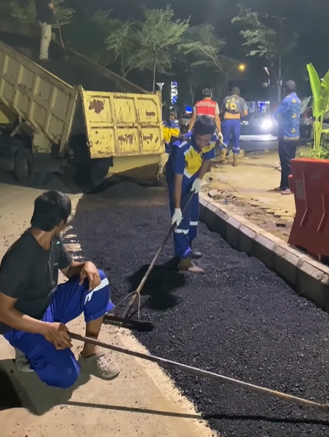 Petugas melakukan penambalan, perataan, serta pemadatan konstruksi jalan agar jalur lalu lintas di sekitar Balai Kota tetap aman dan lancar dilalui. Langkah ini juga bertujuan mencegah kerusakan yang lebih parah akibat intensitas penggunaan jalan serta faktor cuaca.