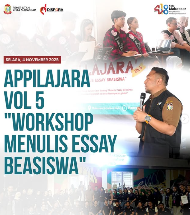MAKASSAR,4Menit.Com — Dinas Pemuda dan Olahraga (Dispora) Kota Makassar selaku leading sektor pengembangan kepemudaan kembali menghadirkan ruang belajar yang progresif melalui gelaran Appilajara Vol. 5. Pada edisi kali ini, kegiatan tersebut mengangkat Workshop “Menulis Essay Beasiswa” sebagai upaya nyata mendukung pencapaian SDGs poin 4: Pendidikan Berkualitas.