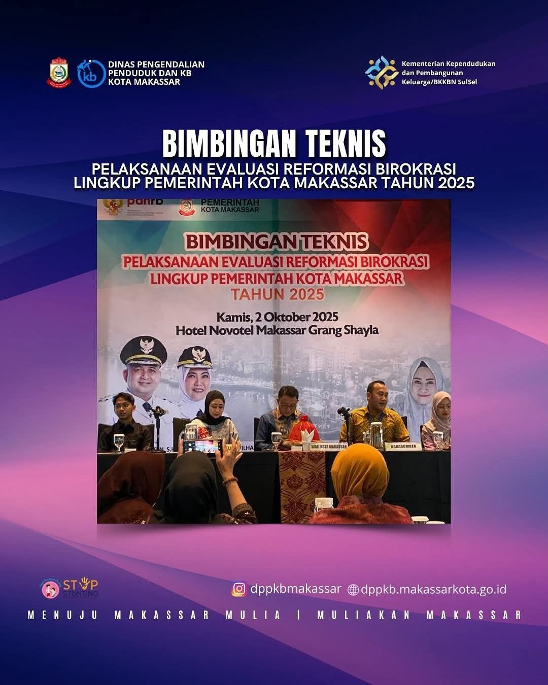 MAKASSAR,4Menit.Com — Kamis, 2 Oktober 2025 — Sejumlah pejabat dari Dinas Pengendalian Penduduk dan Keluarga Berencana (DPPKB) Kota Makassar, yakni Kasubag Umum dan Kepegawaian, Kasubag Keuangan, serta Kasubag Perencanaan dan Pelaporan, menghadiri Bimbingan Teknis (Bimtek) Pelaksanaan Evaluasi Reformasi Birokrasi Lingkup Pemerintah Kota Makassar Tahun 2025.