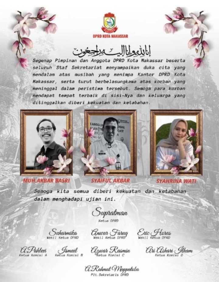 “Segenap Pimpinan dan Anggota DPRD Kota Makassar beserta seluruh Staf Sekretariat menyampaikan duka cita yang mendalam atas musibah yang menimpa Kantor DPRD Kota Makassar, serta turut berbelasungkawa atas wafatnya almarhum Muh. Akbar Basri (Staf Humas Protokol), almarhum Syaiful Akbar (Kasi Kesra Kecamatan Ujung Tanah), dan almarhumah Syahrina Wati (Staf DPRD Kota Makassar),” tulis akun media sosial DPRD Kota Makassar, Sabtu (30/8/2025).