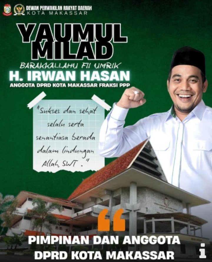 “Selamat Ulang Tahun Bapak H. Irwan Hasan, Anggota DPRD Kota Makassar Fraksi PPP. Semoga senantiasa diberikan kesehatan, keberkahan, dan kesuksesan dalam mengemban amanah untuk masyarakat. Panjang umur, semakin bijak, dan selalu dalam lindungan Allah SWT,” tulis akun media sosial DPRD Kota Makassar.