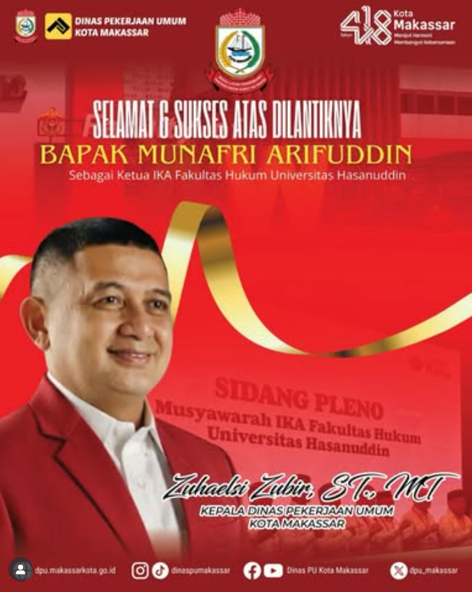 MAKASSAR,4Menit.Com — 14 November 2025 — Kepala Dinas Pekerjaan Umum (PU) Kota Makassar, Zuhaelsi Zubir, menyampaikan ucapan selamat dan sukses kepada Wali Kota Makassar, Munafri Arifuddin, atas pelantikannya sebagai Ketua Ikatan Alumni Fakultas Hukum Universitas Hasanuddin (IKA FH UNHAS) Periode 2025–2029.