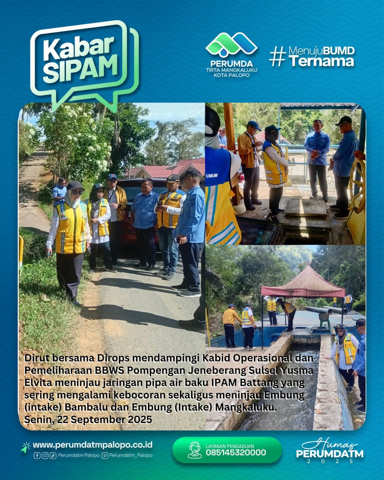 Kegiatan ini dihadiri oleh Direktur Utama dan Direktur Operasional Perumda Tirta Mangkaluku yang mendampingi Kabid Operasional dan Pemeliharaan BBWS Pompengan Jeneberang, Yusma Elvita. Peninjauan meliputi jaringan pipa PVC sepanjang 3,5 km yang sering mengalami kebocoran, serta intake Embung Bambalu dan Embung Mangkaluku.