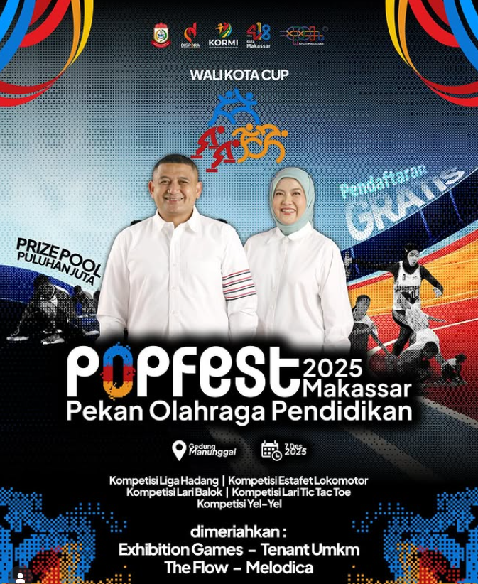 MAKASSAR,4Menit.Com— Dinas Pemuda dan Olahraga (Dispora) bersama Komite Olahraga Rekreasi Masyarakat Indonesia (KORMI) Kota Makassar resmi merilis agenda besar Pekan Olahraga Pendidikan (POPFEST) Makassar, Walikota Cup 2025 melalui kanal resmi Instagram. Ajang ini menjadi kesempatan bagi para pelajar Makassar untuk menunjukkan kemampuan, sportivitas, serta menjadi bagian dari Pekan Olahraga Pendidikan paling meriah tahun ini.