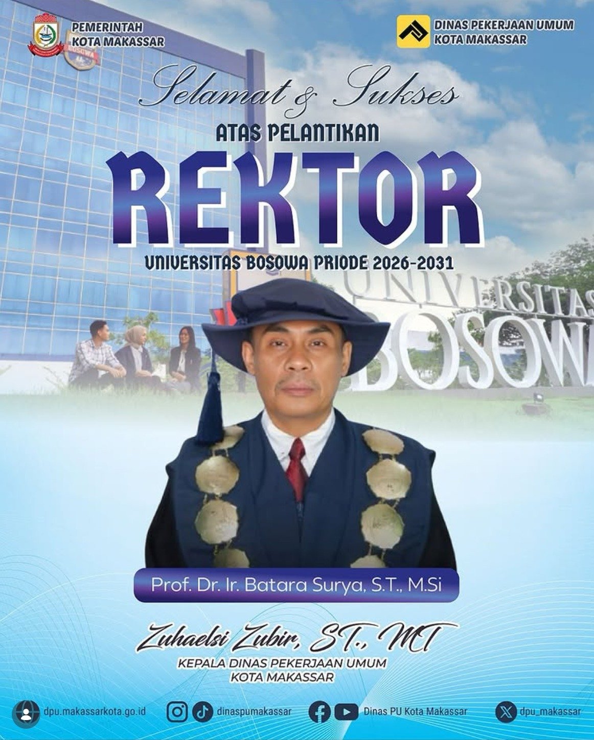 Makassar,4Menit.Com – 7 Maret 2026 — Kepala Dinas Pekerjaan Umum (PU) Kota Makassar menyampaikan ucapan selamat dan sukses kepada Prof. Dr. Ir. Batara Surya, S.T., M.Si. atas pelantikannya sebagai Rektor Universitas Bosowa untuk periode 2026–2031.