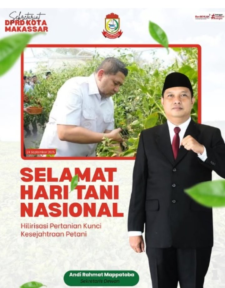 “Sekretariat DPRD Kota Makassar beserta seluruh staf mengucapkan Selamat Hari Tani Nasional. Semoga para petani senantiasa sejahtera, menjadi garda terdepan dalam menjaga ketahanan pangan, serta terus berperan penting bagi kemajuan bangsa,” tulis akun media sosial Setwan Makassar.