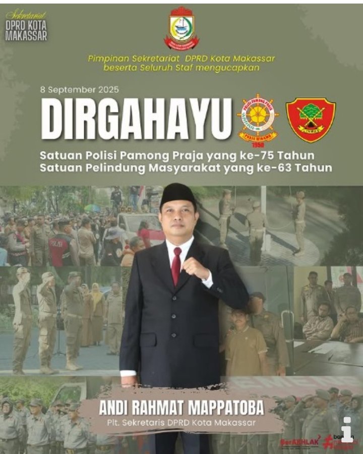 Makassar,Menit.Com – Sekretariat DPRD Kota Makassar mengucapkan selamat hari jadi Satuan Polisi Pamong Praja (Satpol PP) ke-75 dan Satuan Perlindungan Masyarakat (Satlinmas) ke63, pada Senin (8/9/2025) hari ini.